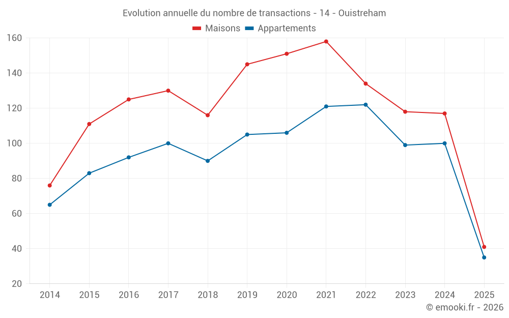 Le prix médian sur les 35 transactions d'appartements des 6 derniers mois dans la commune d'Ouistreham était de 3 625 € par mètre carré pour une valeur foncière médiane de 126 000 €. Sur cette période 60% des transactions se sont situées entre 2 723 et 4 216 € par mètre carré (du 2ème au 8ème déciles).