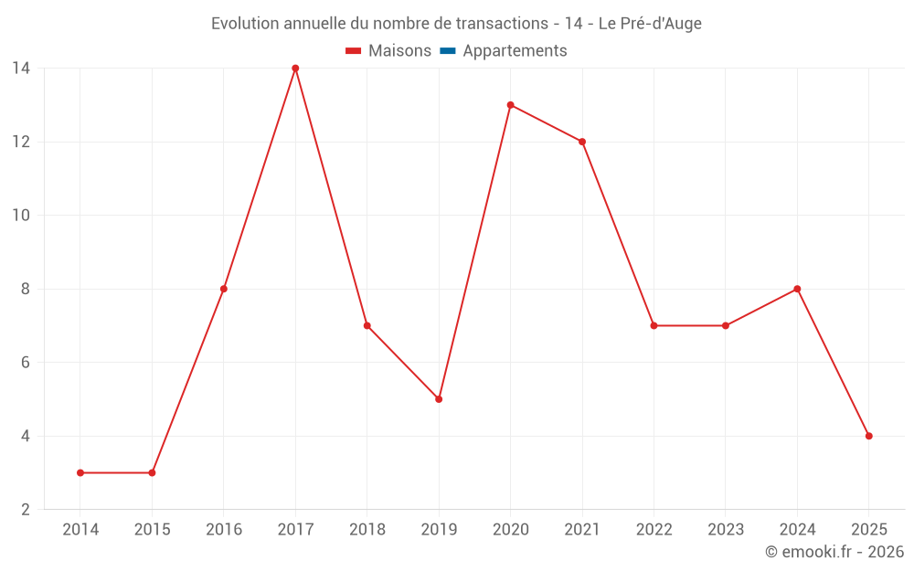 Le prix médian sur les 17 transactions de maisons des 24 derniers mois dans la commune du Pré-d'Auge était de 1 959 € par mètre carré pour une valeur foncière médiane de 237 000 €. Sur cette période 60% des transactions se sont situées entre 1 261 et 2 432 € par mètre carré (du 2ème au 8ème déciles).