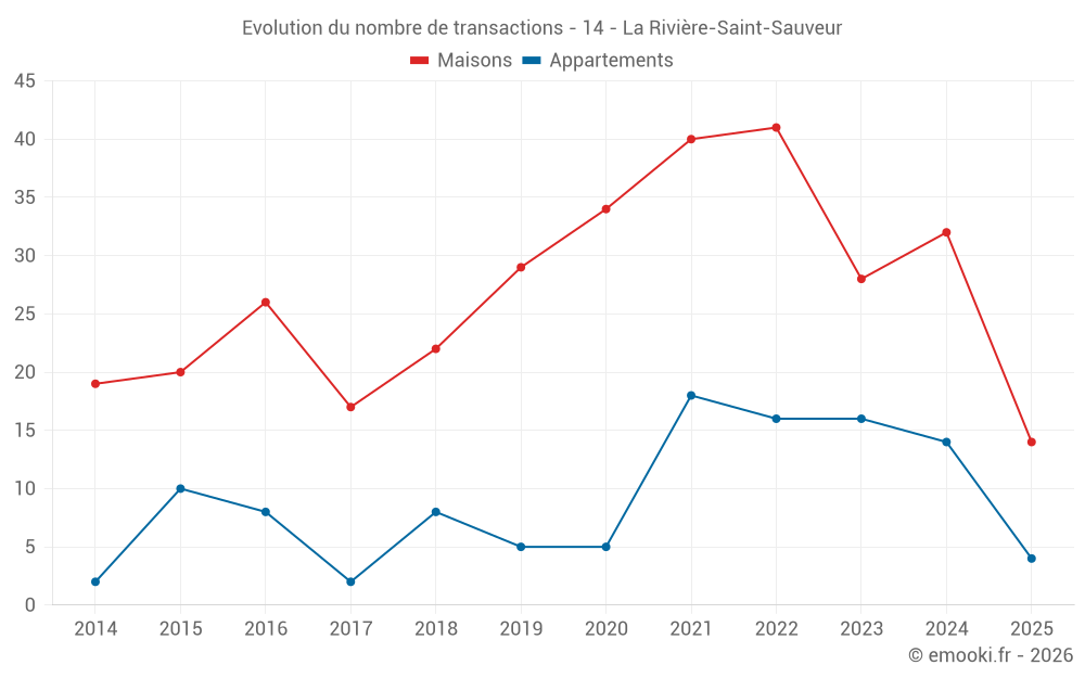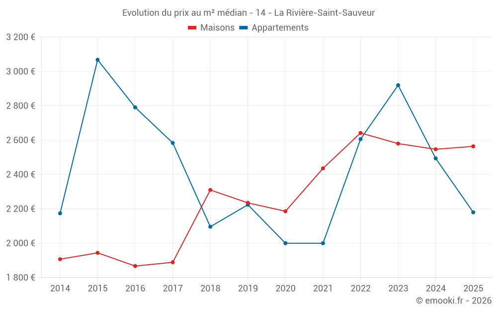 Le prix médian sur les 25 transactions d'appartements des 24 derniers mois dans la commune de la Rivière-Saint-Sauveur était de 2 488 € par mètre carré pour une valeur foncière médiane de 126 000 €. Sur cette période 60% des transactions se sont situées entre 2 257 et 2 943 € par mètre carré (du 2ème au 8ème déciles).