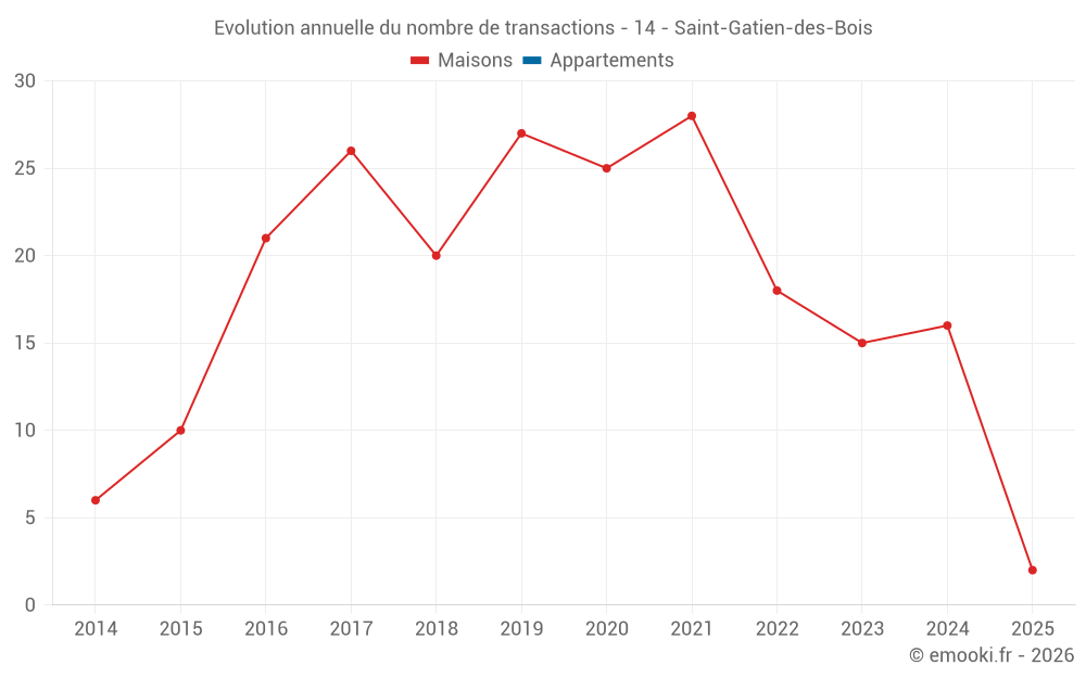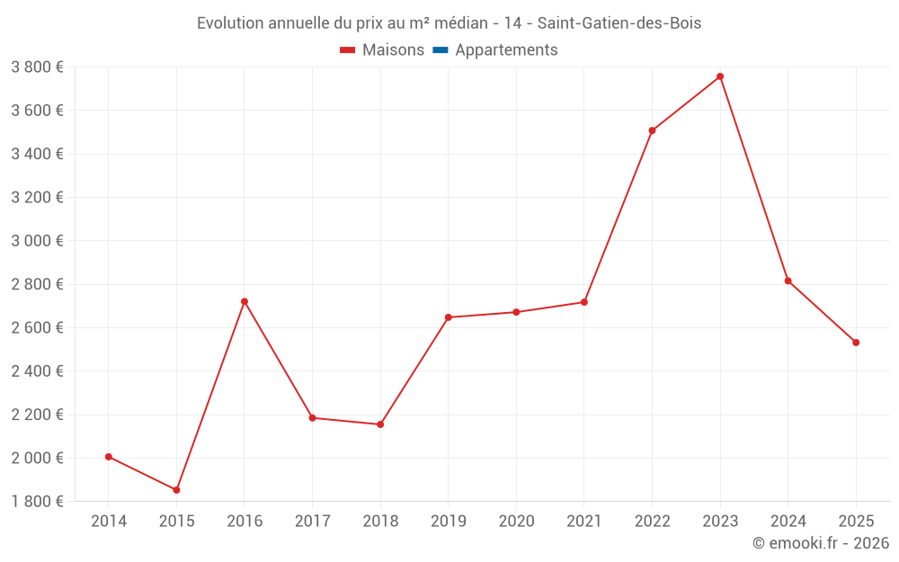 Le prix médian sur les 24 transactions de maisons des 24 derniers mois dans la commune de Saint-Gatien-des-Bois était de 2 816 € par mètre carré pour une valeur foncière médiane de 242 000 €. Sur cette période 60% des transactions se sont situées entre 1 980 et 3 700 € par mètre carré (du 2ème au 8ème déciles).