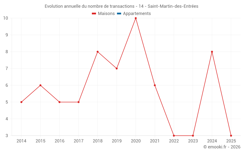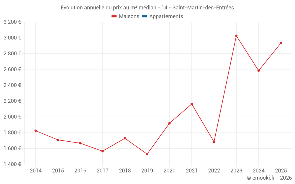 Le prix médian sur les 14 transactions de maisons des 24 derniers mois dans la commune de Saint-Martin-des-Entrées était de 2 872 € par mètre carré pour une valeur foncière médiane de 359 500 €. Sur cette période 60% des transactions se sont situées entre 2 127 et 3 283 € par mètre carré (du 2ème au 8ème déciles).