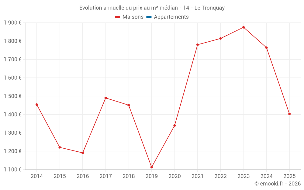 Le prix médian sur les 15 transactions de maisons des 24 derniers mois dans la commune du Tronquay était de 1 825 € par mètre carré pour une valeur foncière médiane de 190 000 €. Sur cette période 60% des transactions se sont situées entre 1 541 et 2 236 € par mètre carré (du 2ème au 8ème déciles).