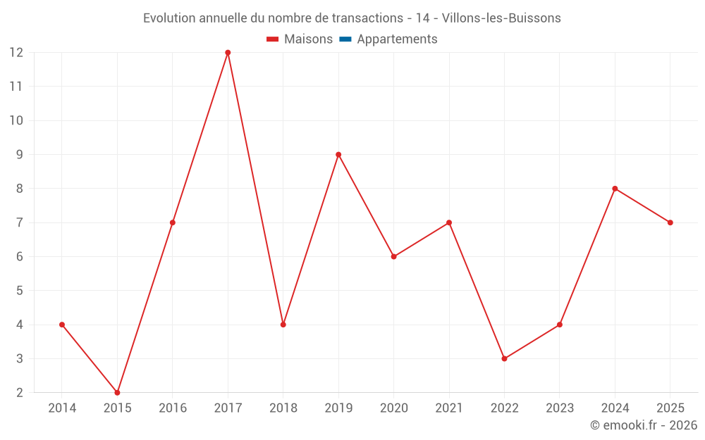 Le prix médian sur les 16 transactions de maisons des 24 derniers mois dans la commune de Villons-les-Buissons était de 2 912 € par mètre carré pour une valeur foncière médiane de 520 575 €. Sur cette période 60% des transactions se sont situées entre 2 221 et 3 813 € par mètre carré (du 2ème au 8ème déciles).