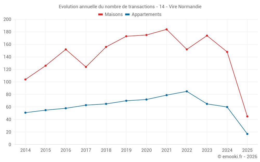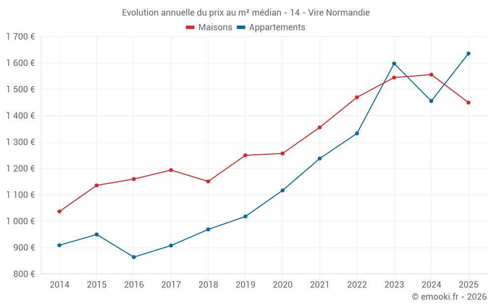 Le prix médian sur les 47 transactions d'appartements des 12 derniers mois dans la commune de Vire Normandie était de 1 606 € par mètre carré pour une valeur foncière médiane de 94 320 €. Sur cette période 60% des transactions se sont situées entre 1 258 et 1 912 € par mètre carré (du 2ème au 8ème déciles).