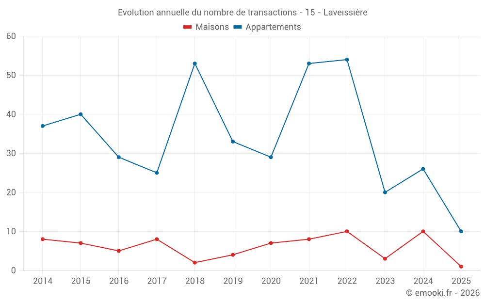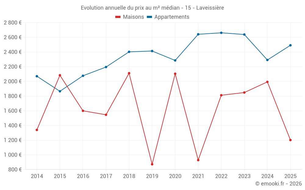 Le prix médian sur les 27 transactions d'appartements des 12 derniers mois dans la commune de Laveissière était de 2 318 € par mètre carré pour une valeur foncière médiane de 57 790 €. Sur cette période 60% des transactions se sont situées entre 1 853 et 2 738 € par mètre carré (du 2ème au 8ème déciles).