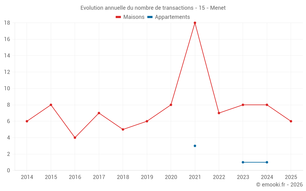 Le prix médian sur les 18 transactions de maisons des 24 derniers mois dans la commune de Menet était de 983 € par mètre carré pour une valeur foncière médiane de 78 750 €. Sur cette période 60% des transactions se sont situées entre 515 et 1 741 € par mètre carré (du 2ème au 8ème déciles).