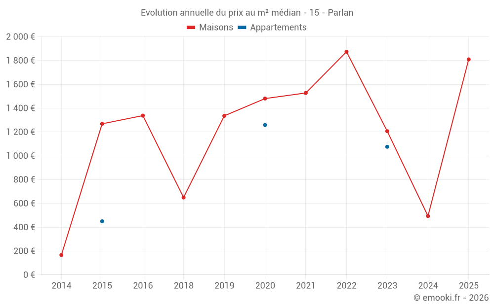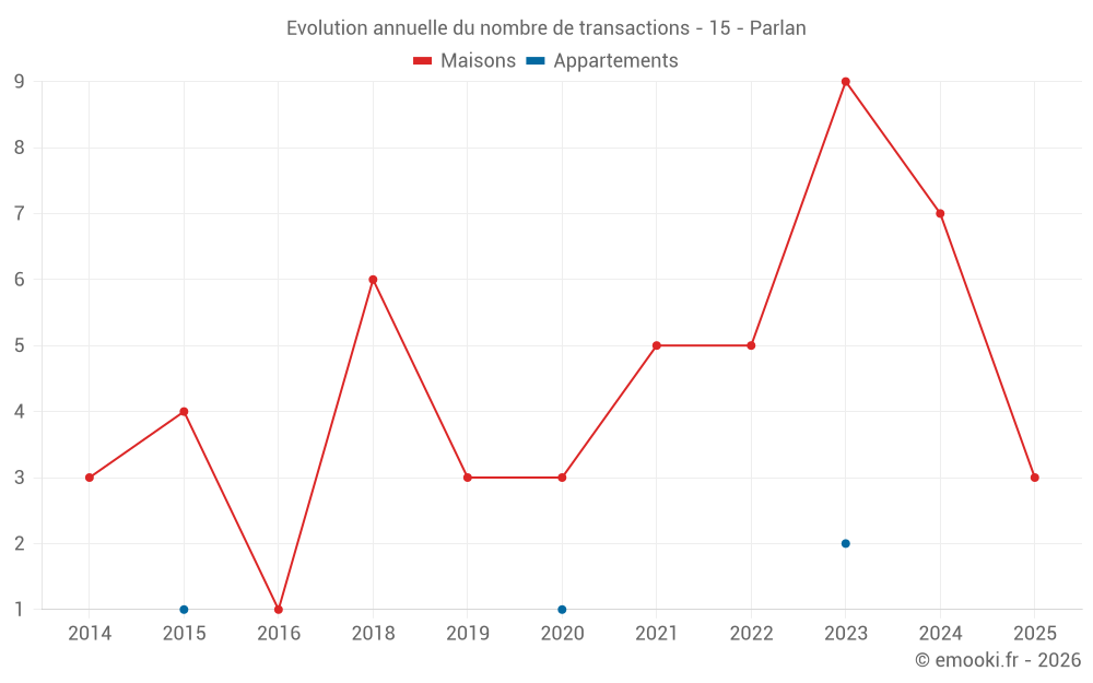 Le prix médian sur les 15 transactions de maisons des 24 derniers mois dans la commune de Parlan était de 1 286 € par mètre carré pour une valeur foncière médiane de 111 879 €. Sur cette période 60% des transactions se sont situées entre 439 et 1 841 € par mètre carré (du 2ème au 8ème déciles).