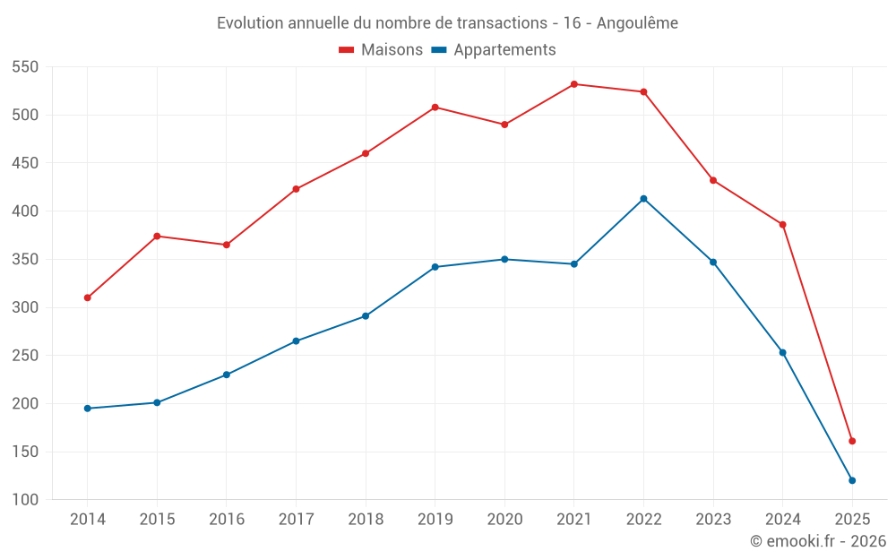 Le prix médian sur les 85 transactions de maisons des 3 derniers mois dans la commune d'Angoulême était de 1 635 € par mètre carré pour une valeur foncière médiane de 142 020 €. Sur cette période 60% des transactions se sont situées entre 1 174 et 2 075 € par mètre carré (du 2ème au 8ème déciles).