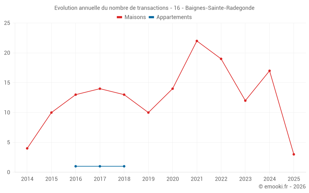Le prix médian sur les 27 transactions de maisons des 24 derniers mois dans la commune de Baignes-Sainte-Radegonde était de 833 € par mètre carré pour une valeur foncière médiane de 108 426 €. Sur cette période 60% des transactions se sont situées entre 442 et 1 485 € par mètre carré (du 2ème au 8ème déciles).