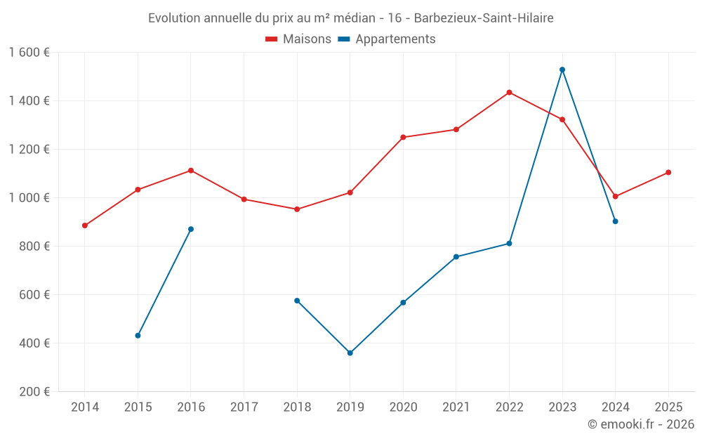 Le prix médian sur les 18 transactions de maisons des 6 derniers mois dans la commune de Barbezieux-Saint-Hilaire était de 1 105 € par mètre carré pour une valeur foncière médiane de 85 000 €. Sur cette période 60% des transactions se sont situées entre 606 et 1 500 € par mètre carré (du 2ème au 8ème déciles).