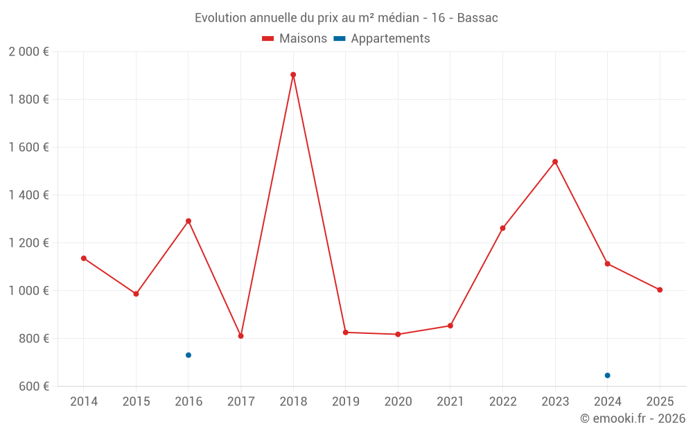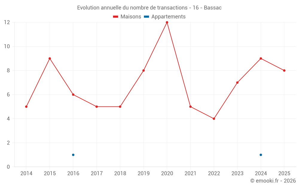 Le prix médian sur les 19 transactions de maisons des 24 derniers mois dans la commune de Bassac était de 1 167 € par mètre carré pour une valeur foncière médiane de 128 000 €. Sur cette période 60% des transactions se sont situées entre 681 et 1 711 € par mètre carré (du 2ème au 8ème déciles).