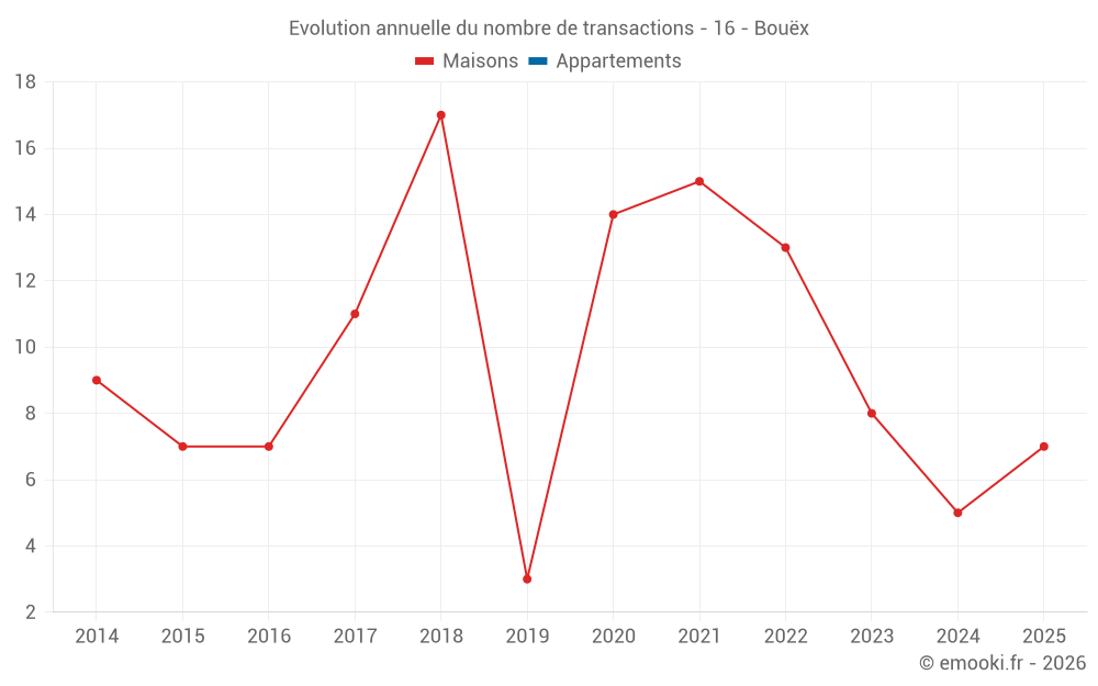 Le prix médian sur les 16 transactions de maisons des 24 derniers mois dans la commune de Bouëx était de 1 511 € par mètre carré pour une valeur foncière médiane de 157 000 €. Sur cette période 60% des transactions se sont situées entre 1 054 et 1 863 € par mètre carré (du 2ème au 8ème déciles).