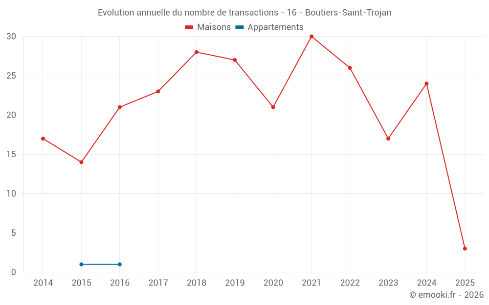 Le prix médian sur les 17 transactions de maisons des 12 derniers mois dans la commune de Boutiers-Saint-Trojan était de 1 842 € par mètre carré pour une valeur foncière médiane de 205 000 €. Sur cette période 60% des transactions se sont situées entre 1 096 et 2 250 € par mètre carré (du 2ème au 8ème déciles).