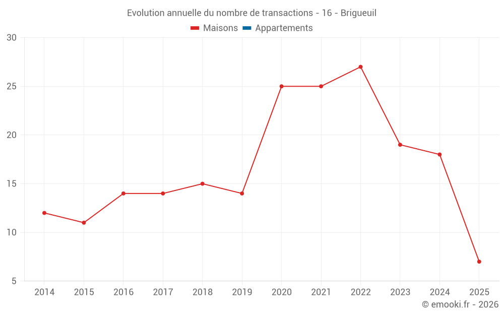 Le prix médian sur les 18 transactions de maisons des 12 derniers mois dans la commune de Brigueuil était de 640 € par mètre carré pour une valeur foncière médiane de 63 950 €. Sur cette période 60% des transactions se sont situées entre 344 et 1 276 € par mètre carré (du 2ème au 8ème déciles).