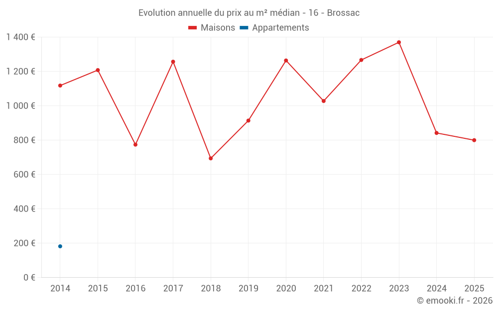 Le prix médian sur les 19 transactions de maisons des 24 derniers mois dans la commune de Brossac était de 907 € par mètre carré pour une valeur foncière médiane de 90 000 €. Sur cette période 60% des transactions se sont situées entre 523 et 1 621 € par mètre carré (du 2ème au 8ème déciles).