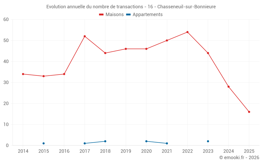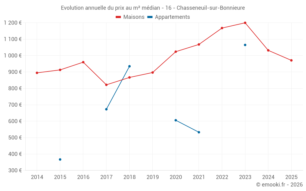 Le prix médian sur les 31 transactions de maisons des 12 derniers mois dans la commune de Chasseneuil-sur-Bonnieure était de 984 € par mètre carré pour une valeur foncière médiane de 112 750 €. Sur cette période 60% des transactions se sont situées entre 714 et 1 505 € par mètre carré (du 2ème au 8ème déciles).