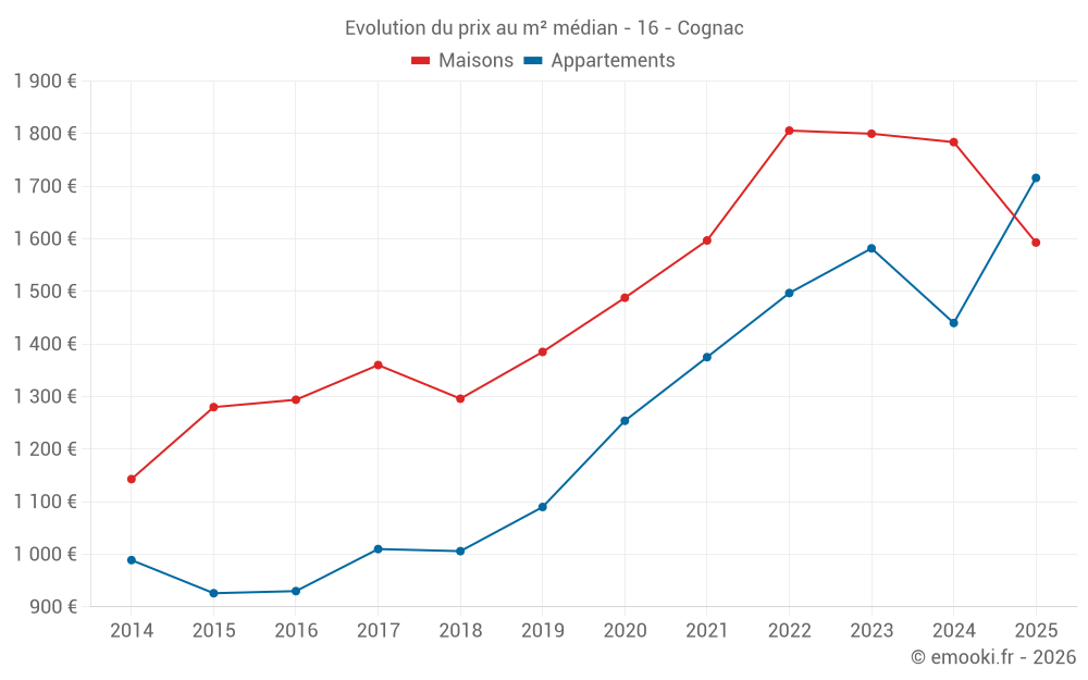 Le prix médian sur les 30 transactions d'appartements des 6 derniers mois dans la commune de Cognac était de 1 716 € par mètre carré pour une valeur foncière médiane de 88 970 €. Sur cette période 60% des transactions se sont situées entre 1 341 et 1 923 € par mètre carré (du 2ème au 8ème déciles).