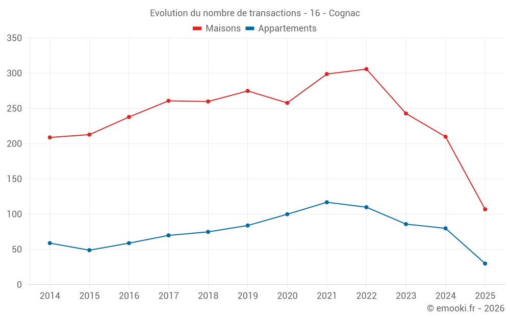 Le prix médian sur les 56 transactions de maisons des 3 derniers mois dans la commune de Cognac était de 1 690 € par mètre carré pour une valeur foncière médiane de 135 000 €. Sur cette période 60% des transactions se sont situées entre 1 193 et 2 137 € par mètre carré (du 2ème au 8ème déciles).