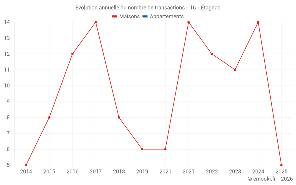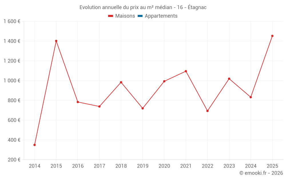 Le prix médian sur les 26 transactions de maisons des 24 derniers mois dans la commune d'Étagnac était de 970 € par mètre carré pour une valeur foncière médiane de 94 000 €. Sur cette période 60% des transactions se sont situées entre 400 et 1 453 € par mètre carré (du 2ème au 8ème déciles).