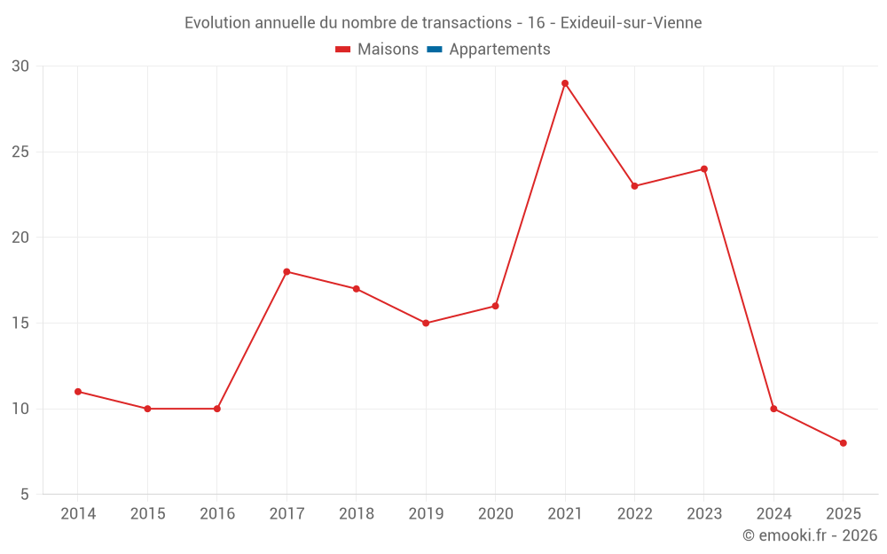 Le prix médian sur les 26 transactions de maisons des 24 derniers mois dans la commune d'Exideuil-sur-Vienne était de 1 036 € par mètre carré pour une valeur foncière médiane de 100 584 €. Sur cette période 60% des transactions se sont situées entre 294 et 1 365 € par mètre carré (du 2ème au 8ème déciles).