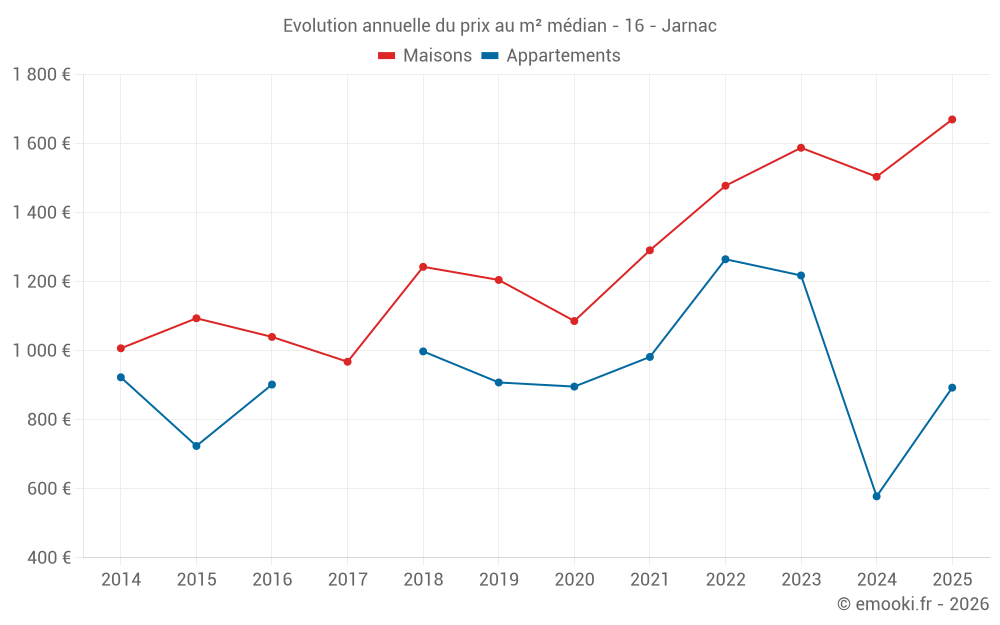 Le prix médian sur les 22 transactions de maisons des 3 derniers mois dans la commune de Jarnac était de 1 350 € par mètre carré pour une valeur foncière médiane de 137 500 €. Sur cette période 60% des transactions se sont situées entre 1 084 et 2 038 € par mètre carré (du 2ème au 8ème déciles).