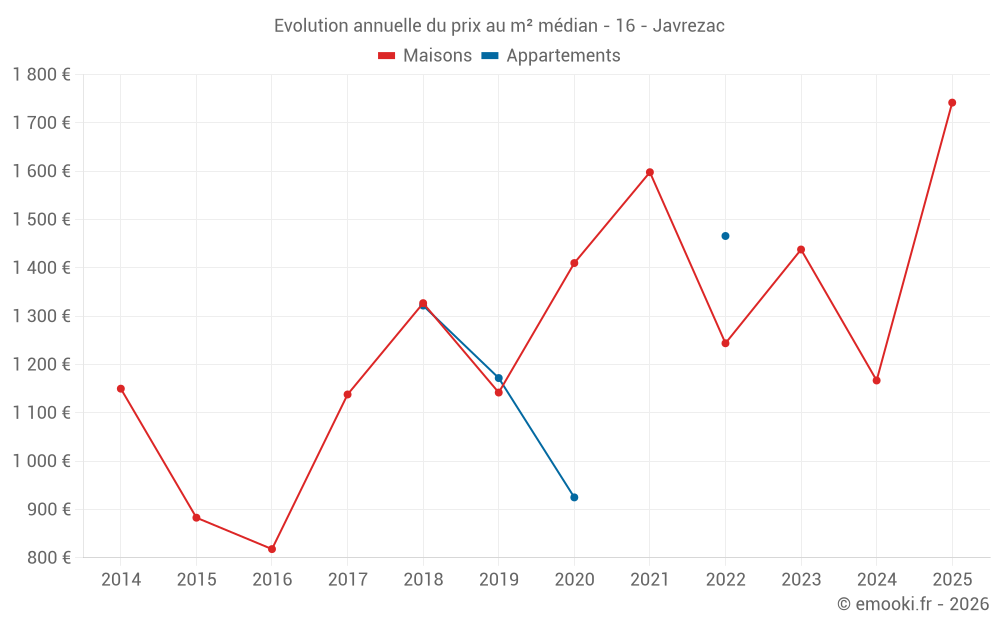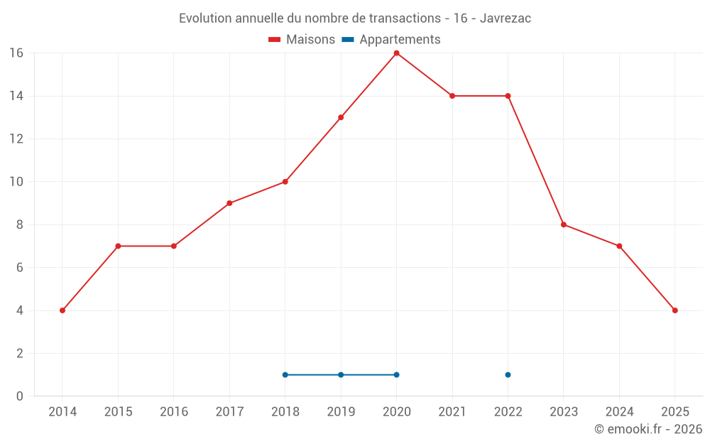Le prix médian sur les 14 transactions de maisons des 24 derniers mois dans la commune de Javrezac était de 1 282 € par mètre carré pour une valeur foncière médiane de 105 000 €. Sur cette période 60% des transactions se sont situées entre 772 et 1 939 € par mètre carré (du 2ème au 8ème déciles).