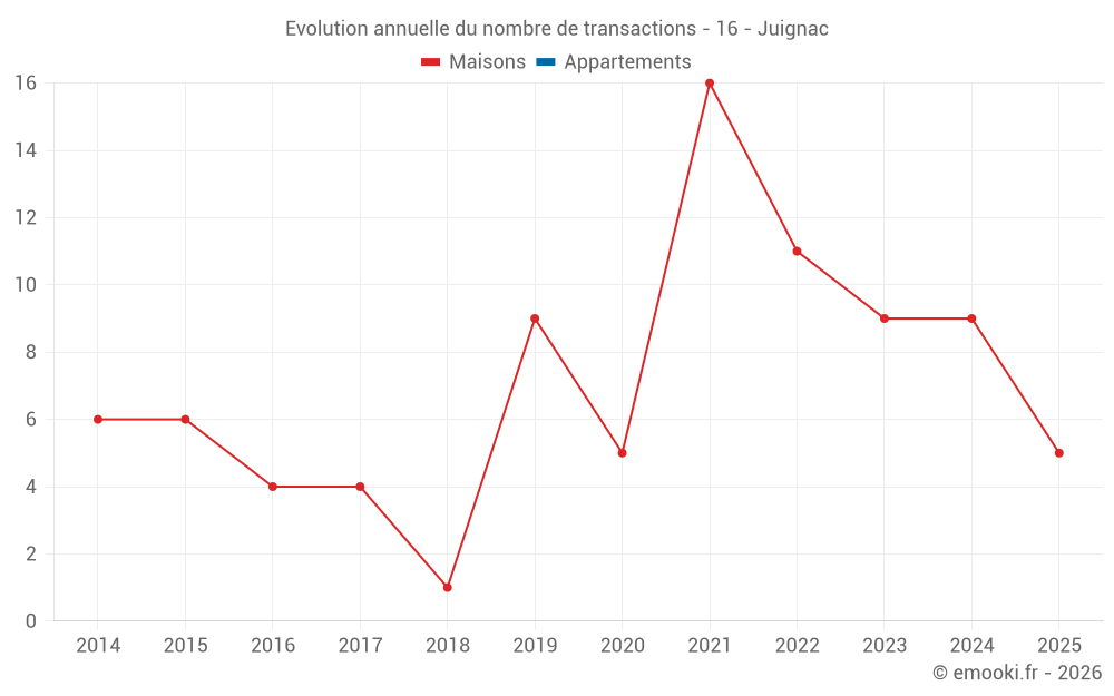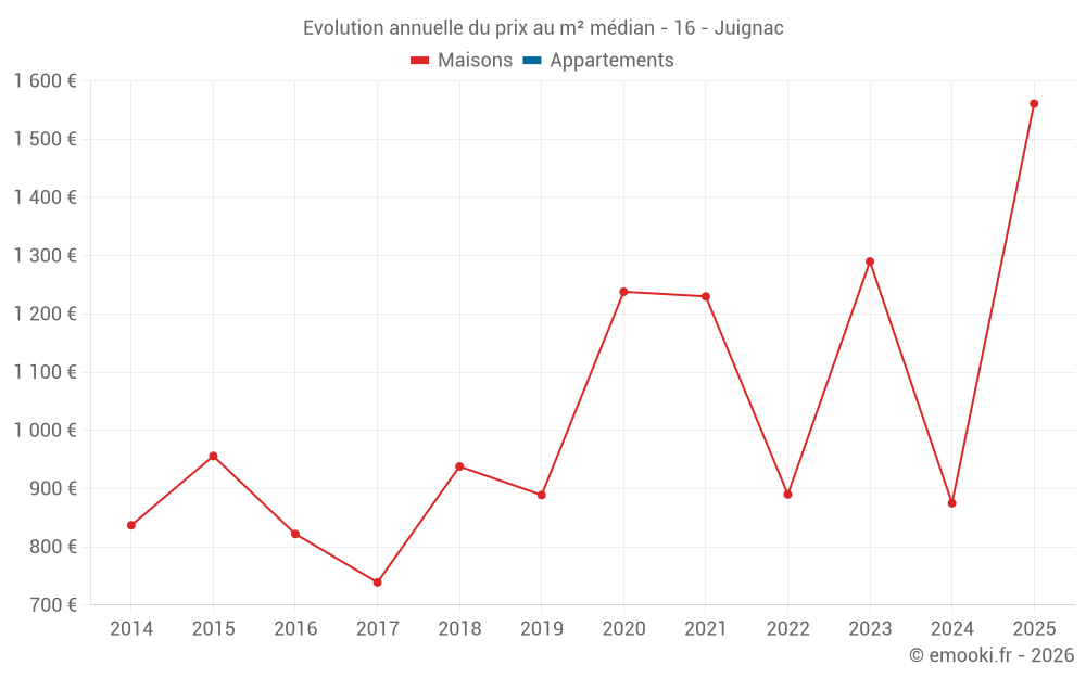 Le prix médian sur les 20 transactions de maisons des 24 derniers mois dans la commune de Juignac était de 1 172 € par mètre carré pour une valeur foncière médiane de 90 000 €. Sur cette période 60% des transactions se sont situées entre 788 et 1 707 € par mètre carré (du 2ème au 8ème déciles).