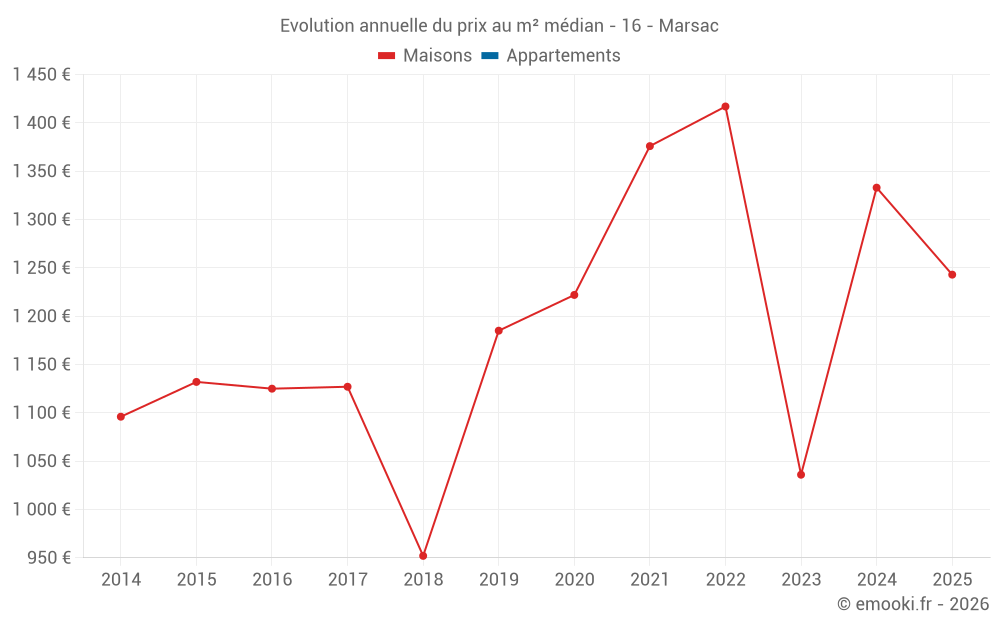 Le prix médian sur les 14 transactions de maisons des 24 derniers mois dans la commune de Marsac était de 1 196 € par mètre carré pour une valeur foncière médiane de 127 500 €. Sur cette période 60% des transactions se sont situées entre 754 et 1 448 € par mètre carré (du 2ème au 8ème déciles).