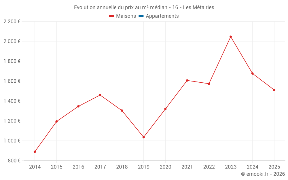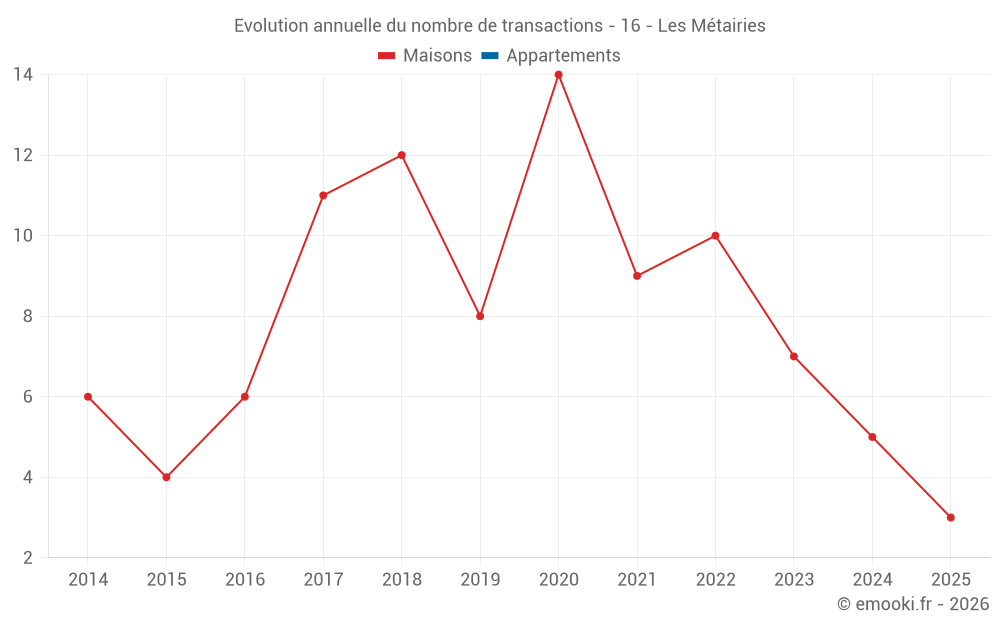 Le prix médian sur les 14 transactions de maisons des 24 derniers mois dans la commune des Métairies était de 1 943 € par mètre carré pour une valeur foncière médiane de 204 600 €. Sur cette période 60% des transactions se sont situées entre 1 490 et 2 352 € par mètre carré (du 2ème au 8ème déciles).