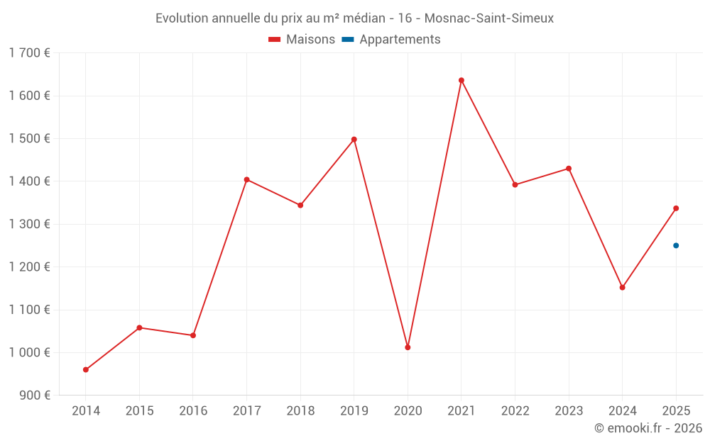 Le prix médian sur les 21 transactions de maisons des 24 derniers mois dans la commune de Mosnac-Saint-Simeux était de 1 284 € par mètre carré pour une valeur foncière médiane de 143 000 €. Sur cette période 60% des transactions se sont situées entre 771 et 1 979 € par mètre carré (du 2ème au 8ème déciles).