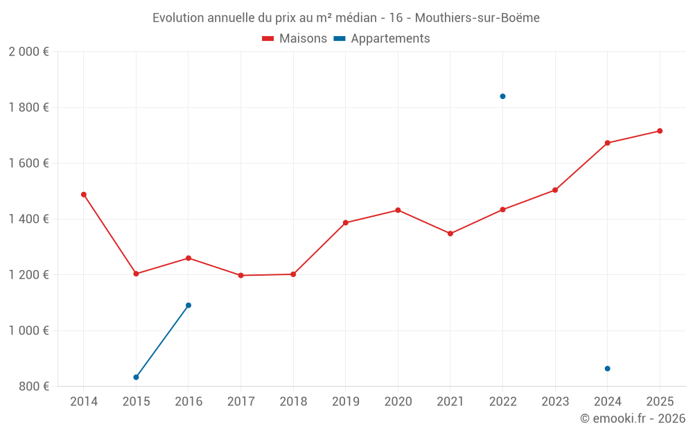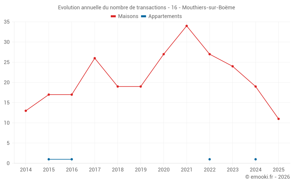 Le prix médian sur les 23 transactions de maisons des 12 derniers mois dans la commune de Mouthiers-sur-Boëme était de 1 899 € par mètre carré pour une valeur foncière médiane de 175 000 €. Sur cette période 60% des transactions se sont situées entre 1 229 et 2 150 € par mètre carré (du 2ème au 8ème déciles).