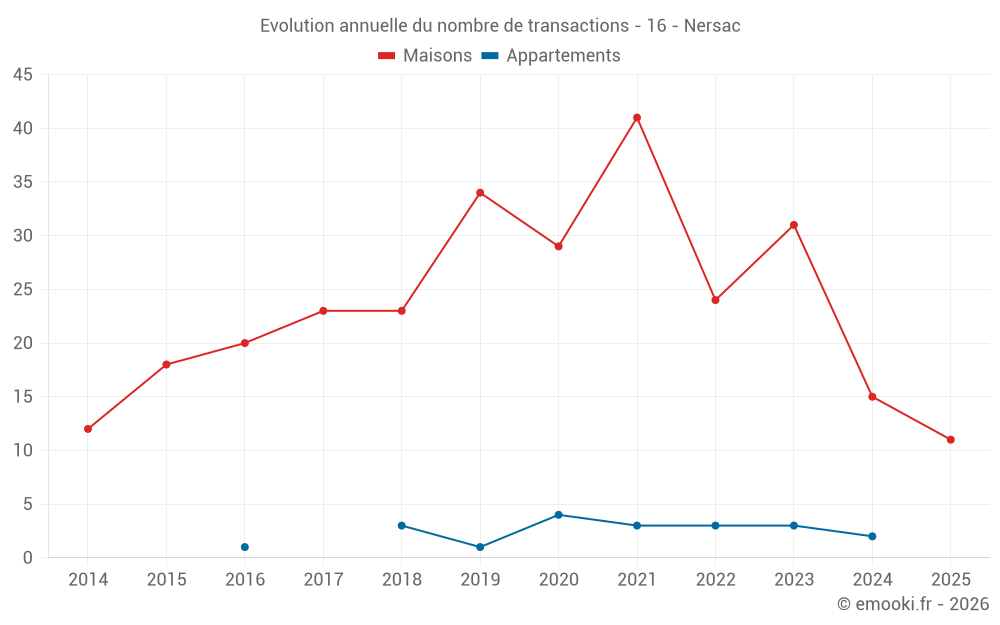 Le prix médian sur les 17 transactions de maisons des 12 derniers mois dans la commune de Nersac était de 1 482 € par mètre carré pour une valeur foncière médiane de 130 000 €. Sur cette période 60% des transactions se sont situées entre 1 314 et 1 934 € par mètre carré (du 2ème au 8ème déciles).