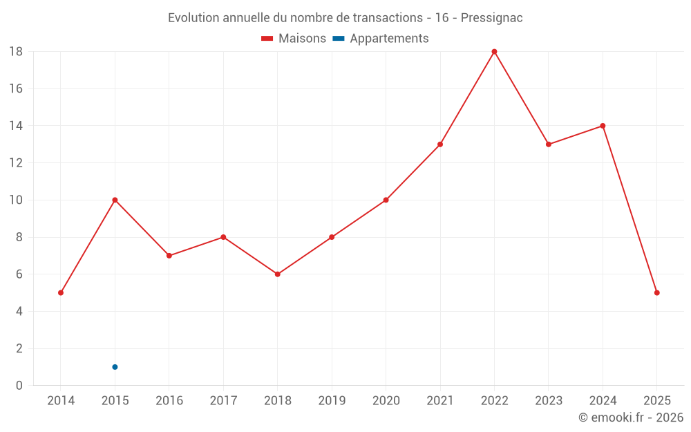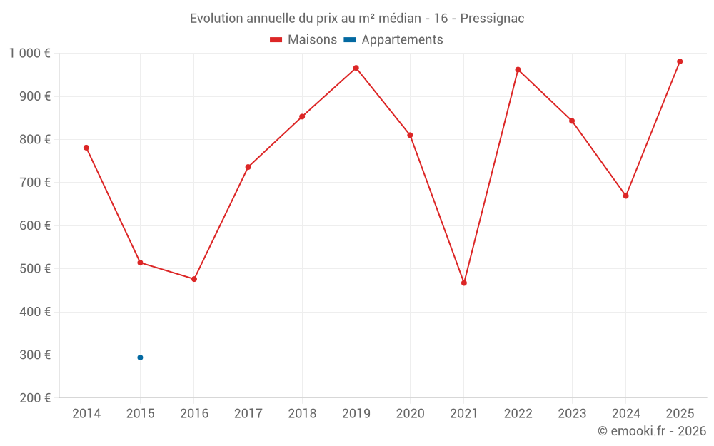 Le prix médian sur les 22 transactions de maisons des 24 derniers mois dans la commune de Pressignac était de 769 € par mètre carré pour une valeur foncière médiane de 92 450 €. Sur cette période 60% des transactions se sont situées entre 530 et 1 158 € par mètre carré (du 2ème au 8ème déciles).