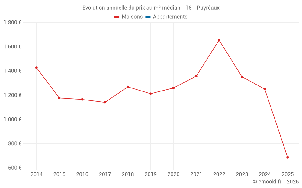 Le prix médian sur les 15 transactions de maisons des 24 derniers mois dans la commune de Puyréaux était de 1 250 € par mètre carré pour une valeur foncière médiane de 111 000 €. Sur cette période 60% des transactions se sont situées entre 655 et 1 515 € par mètre carré (du 2ème au 8ème déciles).