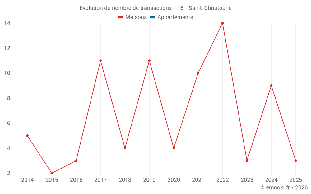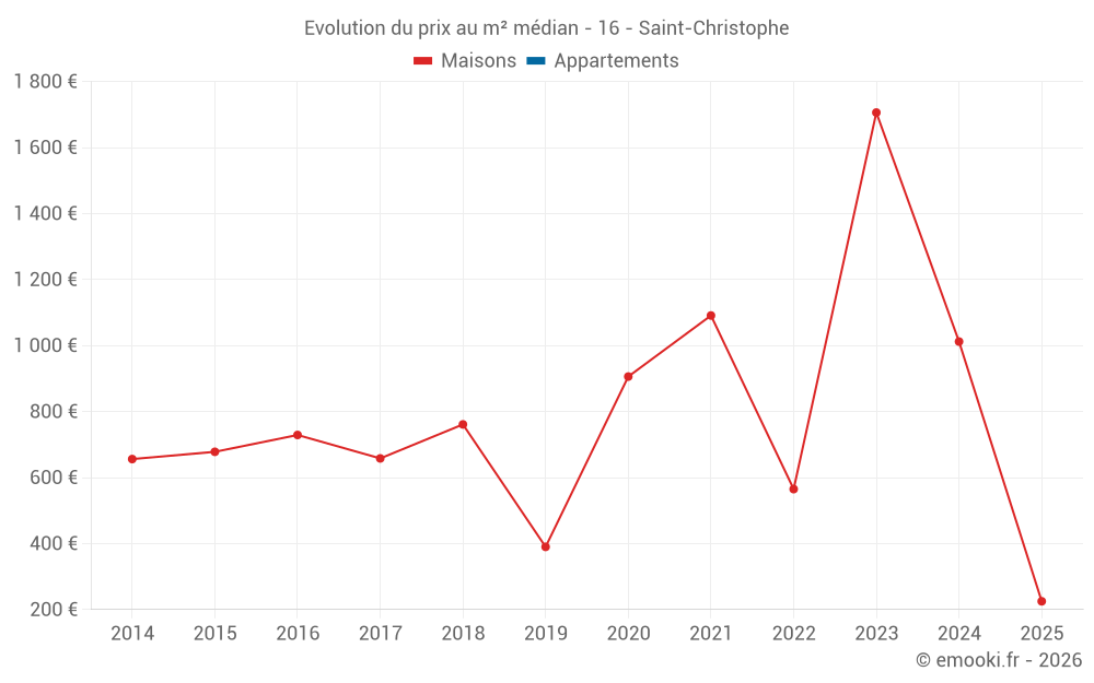Le prix médian sur les 14 transactions de maisons des 24 derniers mois dans la commune de Saint-Christophe était de 910 € par mètre carré pour une valeur foncière médiane de 79 500 €. Sur cette période 60% des transactions se sont situées entre 450 et 1 218 € par mètre carré (du 2ème au 8ème déciles).
