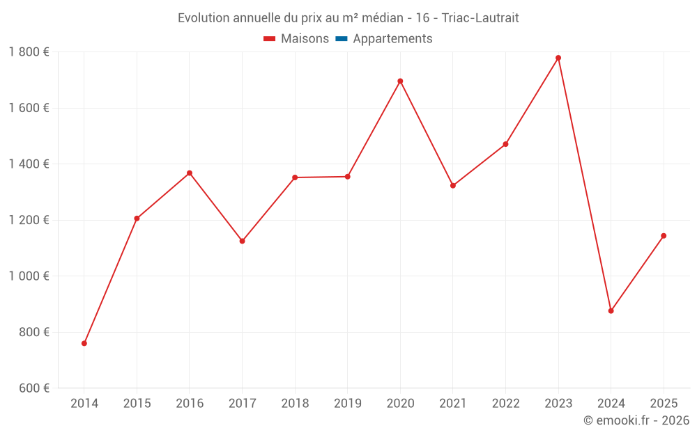 Le prix médian sur les 15 transactions de maisons des 24 derniers mois dans la commune de Triac-Lautrait était de 1 053 € par mètre carré pour une valeur foncière médiane de 100 000 €. Sur cette période 60% des transactions se sont situées entre 621 et 1 864 € par mètre carré (du 2ème au 8ème déciles).