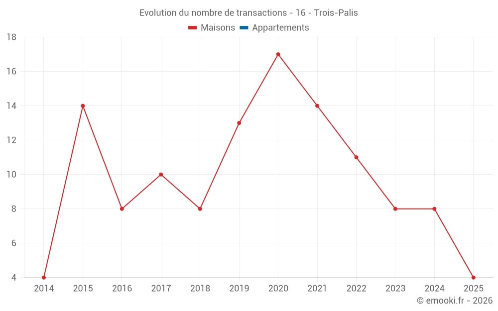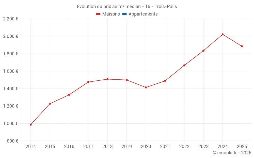 Le prix médian sur les 18 transactions de maisons des 24 derniers mois dans la commune de Trois-Palis était de 1 886 € par mètre carré pour une valeur foncière médiane de 181 000 €. Sur cette période 60% des transactions se sont situées entre 1 645 et 2 199 € par mètre carré (du 2ème au 8ème déciles).