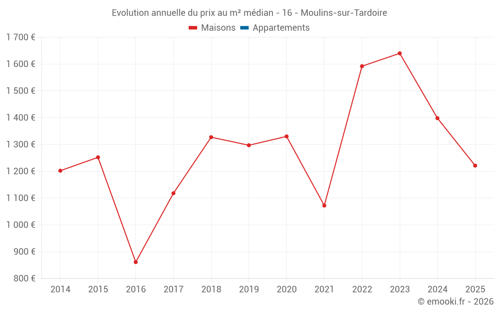 Le prix médian sur les 15 transactions de maisons des 24 derniers mois dans la commune de Moulins-sur-Tardoire était de 1 272 € par mètre carré pour une valeur foncière médiane de 143 500 €. Sur cette période 60% des transactions se sont situées entre 928 et 1 601 € par mètre carré (du 2ème au 8ème déciles).