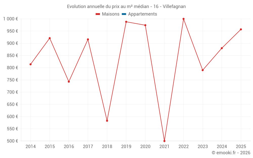 Le prix médian sur les 20 transactions de maisons des 24 derniers mois dans la commune de Villefagnan était de 852 € par mètre carré pour une valeur foncière médiane de 76 000 €. Sur cette période 60% des transactions se sont situées entre 586 et 1 400 € par mètre carré (du 2ème au 8ème déciles).