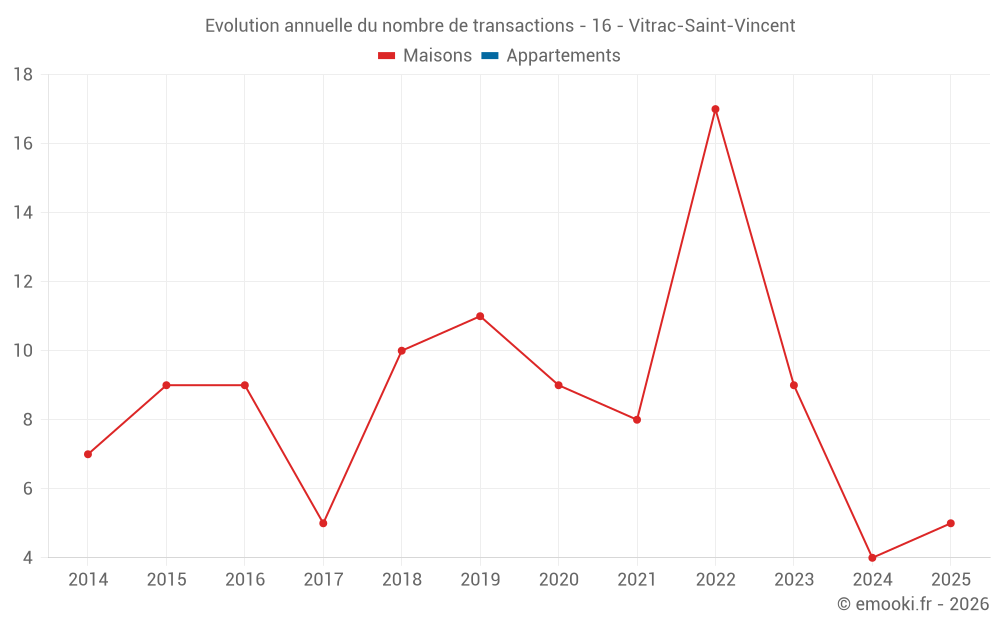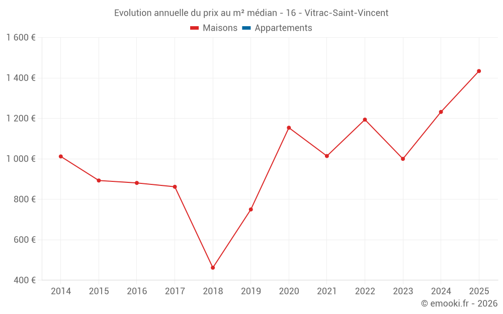 Le prix médian sur les 14 transactions de maisons des 24 derniers mois dans la commune de Vitrac-Saint-Vincent était de 1 278 € par mètre carré pour une valeur foncière médiane de 138 375 €. Sur cette période 60% des transactions se sont situées entre 774 et 1 838 € par mètre carré (du 2ème au 8ème déciles).