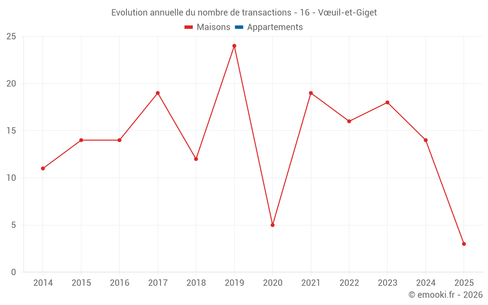 Le prix médian sur les 27 transactions de maisons des 24 derniers mois dans la commune de Vœuil-et-Giget était de 1 664 € par mètre carré pour une valeur foncière médiane de 179 450 €. Sur cette période 60% des transactions se sont situées entre 1 334 et 2 123 € par mètre carré (du 2ème au 8ème déciles).