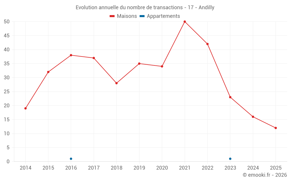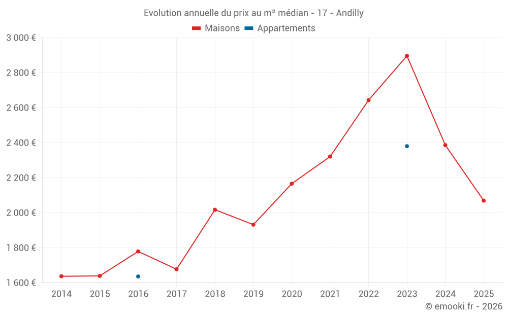 Le prix médian sur les 22 transactions de maisons des 12 derniers mois dans la commune d'Andilly était de 2 387 € par mètre carré pour une valeur foncière médiane de 261 579 €. Sur cette période 60% des transactions se sont situées entre 1 457 et 3 021 € par mètre carré (du 2ème au 8ème déciles).