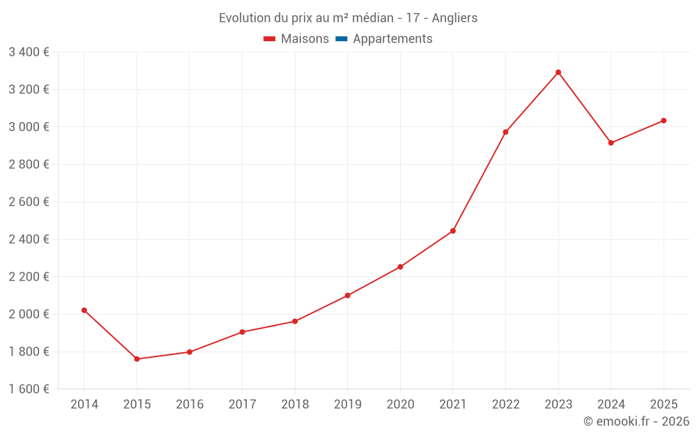 Le prix médian sur les 22 transactions de maisons des 12 derniers mois dans la commune d'Angliers était de 2 996 € par mètre carré pour une valeur foncière médiane de 289 264 €. Sur cette période 60% des transactions se sont situées entre 2 449 et 3 467 € par mètre carré (du 2ème au 8ème déciles).