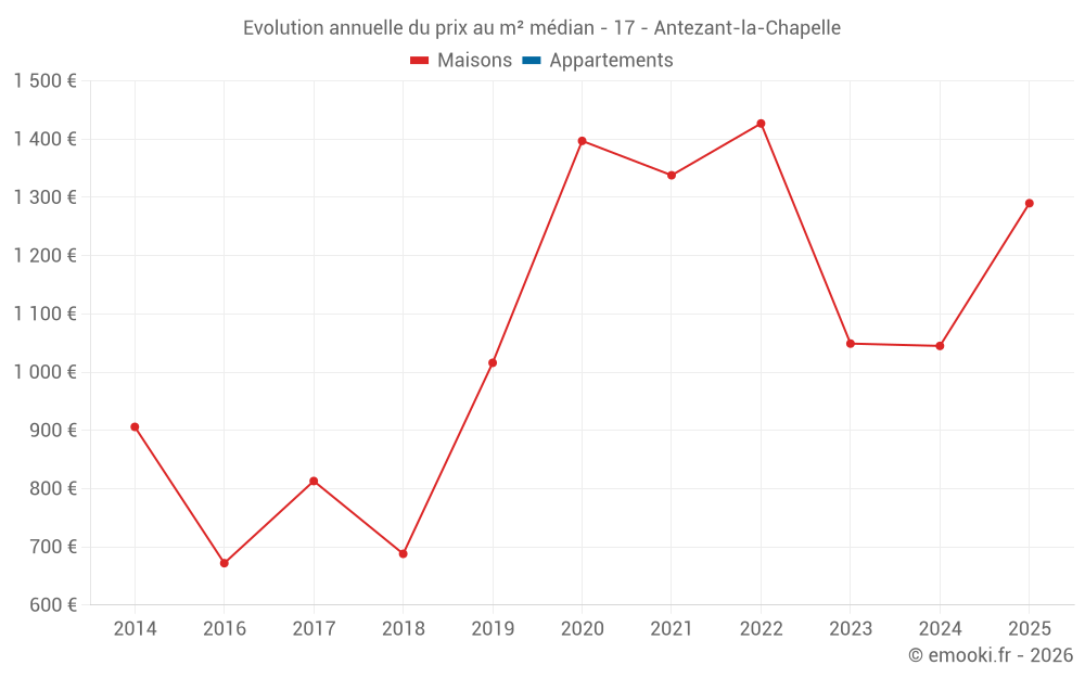 Le prix médian sur les 17 transactions de maisons des 24 derniers mois dans la commune d'Antezant-la-Chapelle était de 1 090 € par mètre carré pour une valeur foncière médiane de 100 000 €. Sur cette période 60% des transactions se sont situées entre 768 et 1 461 € par mètre carré (du 2ème au 8ème déciles).