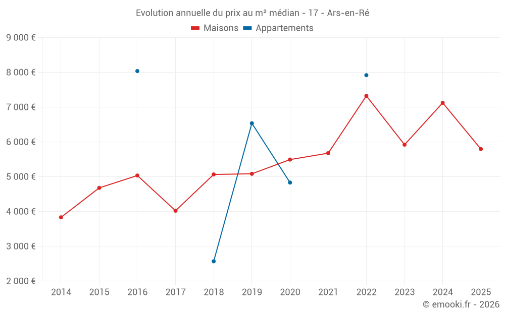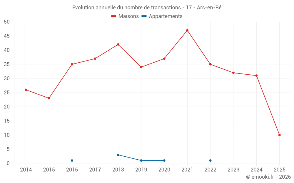 Le prix médian sur les 34 transactions de maisons des 12 derniers mois dans la commune d'Ars-en-Ré était de 6 850 € par mètre carré pour une valeur foncière médiane de 625 000 €. Sur cette période 60% des transactions se sont situées entre 5 162 et 8 281 € par mètre carré (du 2ème au 8ème déciles).