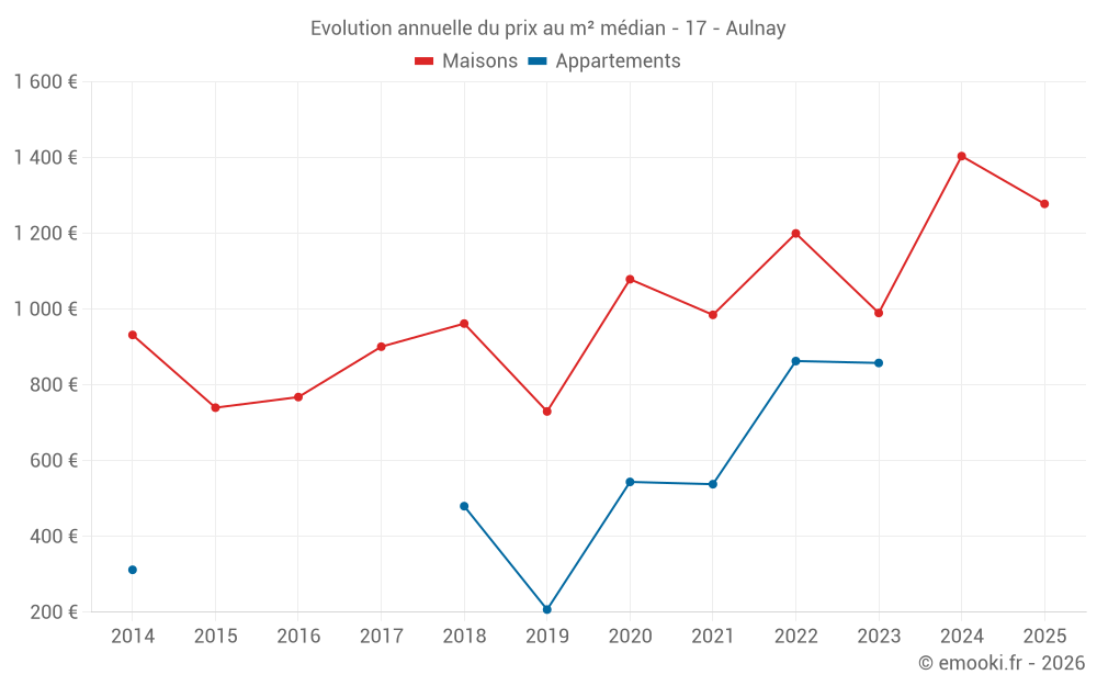 Le prix médian sur les 27 transactions de maisons des 12 derniers mois dans la commune d'Aulnay était de 1 414 € par mètre carré pour une valeur foncière médiane de 130 000 €. Sur cette période 60% des transactions se sont situées entre 909 et 1 730 € par mètre carré (du 2ème au 8ème déciles).