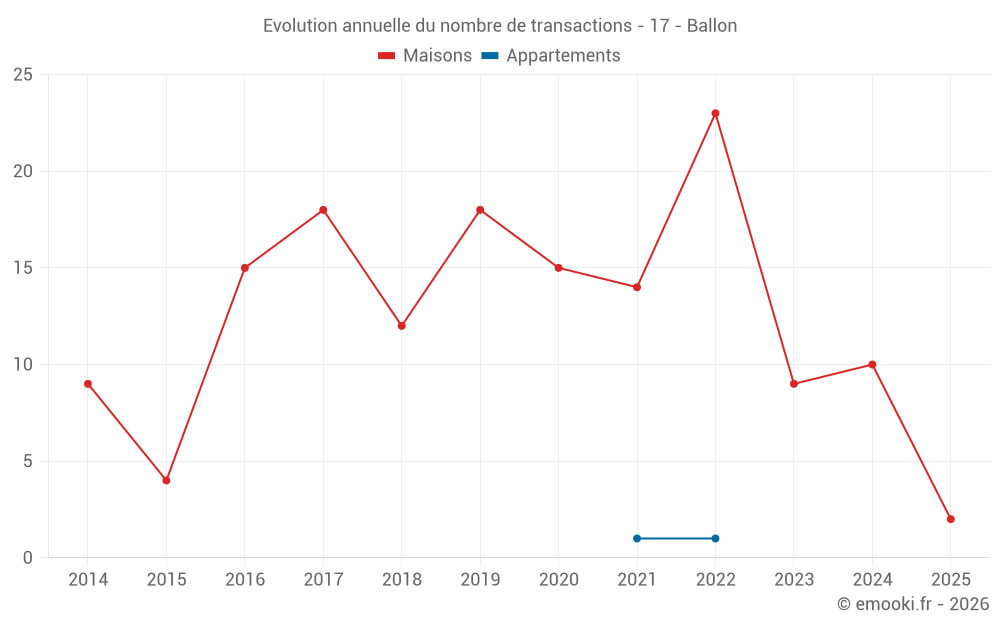 Le prix médian sur les 16 transactions de maisons des 24 derniers mois dans la commune de Ballon était de 2 786 € par mètre carré pour une valeur foncière médiane de 264 138 €. Sur cette période 60% des transactions se sont situées entre 1 875 et 3 200 € par mètre carré (du 2ème au 8ème déciles).