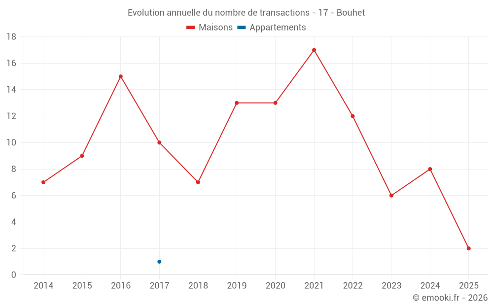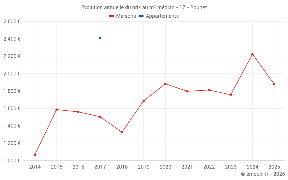 Le prix médian sur les 15 transactions de maisons des 24 derniers mois dans la commune de Bouhet était de 2 163 € par mètre carré pour une valeur foncière médiane de 212 000 €. Sur cette période 60% des transactions se sont situées entre 1 451 et 2 536 € par mètre carré (du 2ème au 8ème déciles).