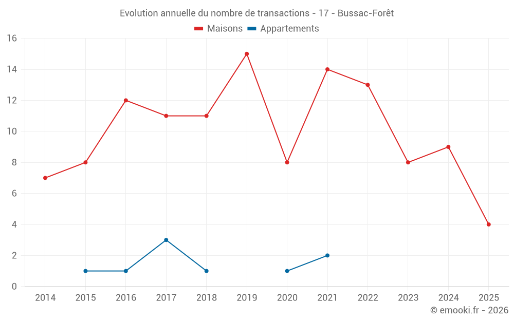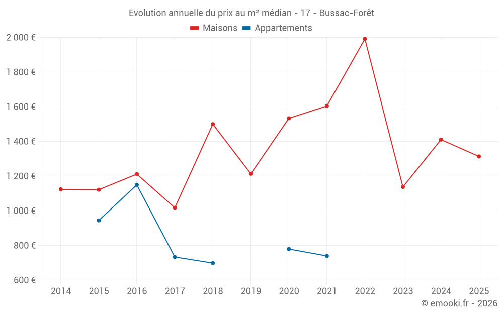 Le prix médian sur les 16 transactions de maisons des 24 derniers mois dans la commune de Bussac-Forêt était de 1 391 € par mètre carré pour une valeur foncière médiane de 172 500 €. Sur cette période 60% des transactions se sont situées entre 1 000 et 1 783 € par mètre carré (du 2ème au 8ème déciles).