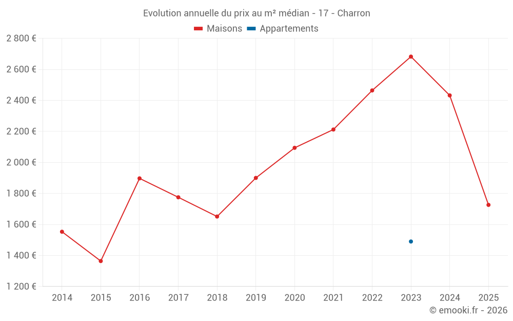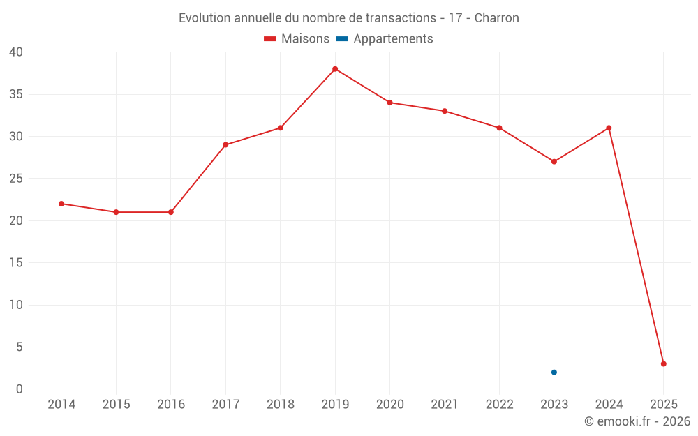 Le prix médian sur les 21 transactions de maisons des 12 derniers mois dans la commune de Charron était de 2 432 € par mètre carré pour une valeur foncière médiane de 220 000 €. Sur cette période 60% des transactions se sont situées entre 1 690 et 2 902 € par mètre carré (du 2ème au 8ème déciles).